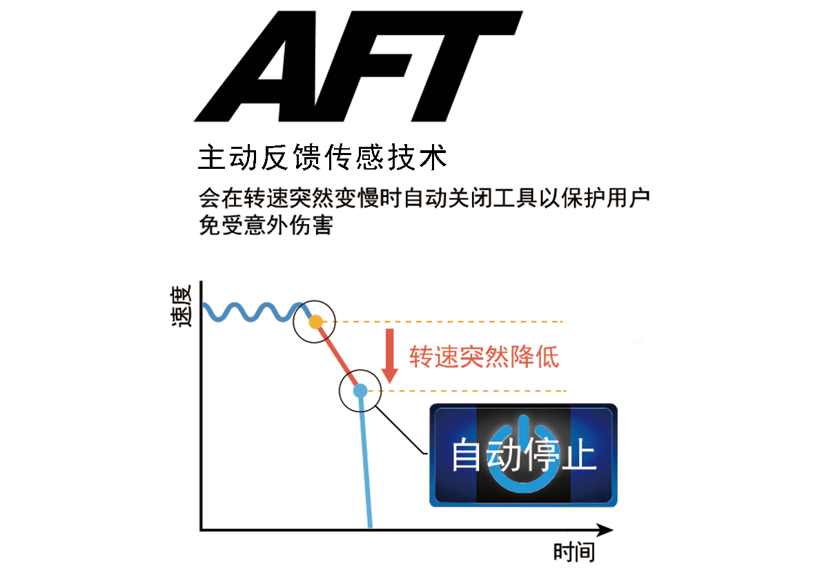 AFT主动反馈传感技术会在速度突然变慢时自动关闭工具以保护用户免受意外伤害