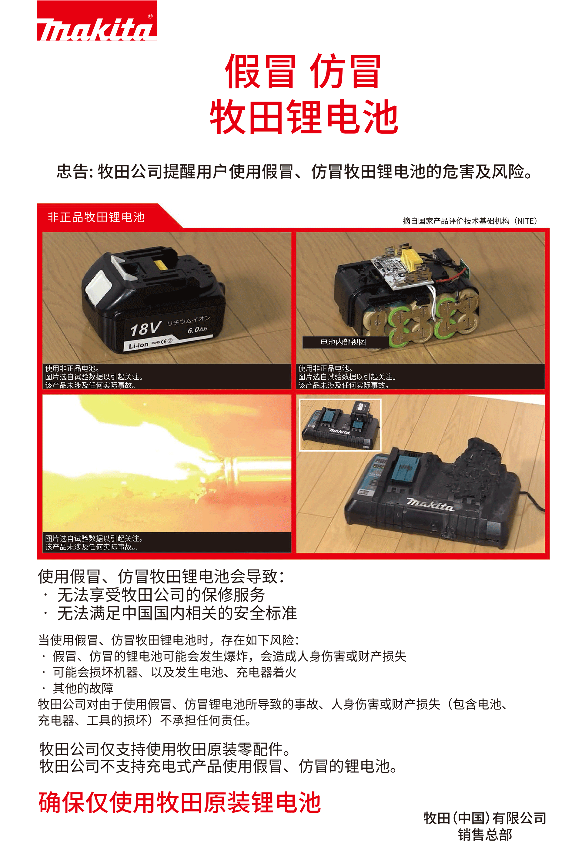 忠告:牧田公司提醒用户使用假冒、仿冒牧田电池的危害及风险。